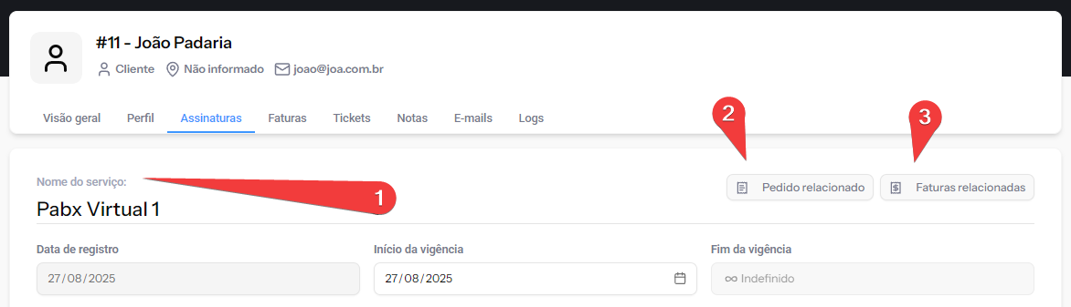 A tela de serviço/assinatura dentro do Dashboard do Cliente é o ponto central para acompanhar e ajustar tudo que envolve um contrato: vigência, cobrança, status, valores e integrações.