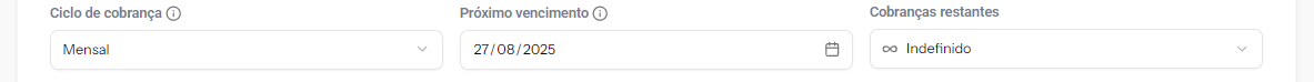Cobranças restantes → Número de parcelas ainda a serem geradas (em caso de prazo definido).