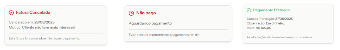 Cancelado/Estornado – conforme ajustes manuais ou automáticos.