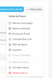 É a partir desta tela que você pode acompanhar o status da fatura, editar informações e até visualizar como o cliente enxerga a cobrança.