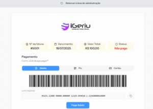 A aba Faturas no Dashboard do Cliente é o ponto central para gerenciar cobranças: você acompanha os detalhes da emissão, confere status de pagamento, visualiza itens cobrados e até enxerga a mesma tela que o cliente acessa para realizar o pagamento.
