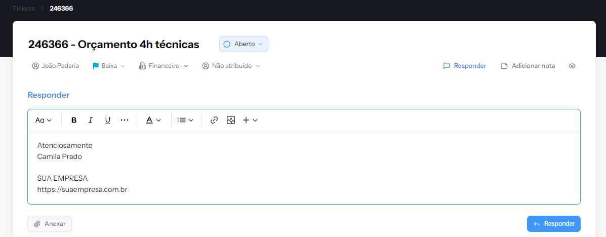Na própria tela do ticket, você pode responder diretamente ao cliente.