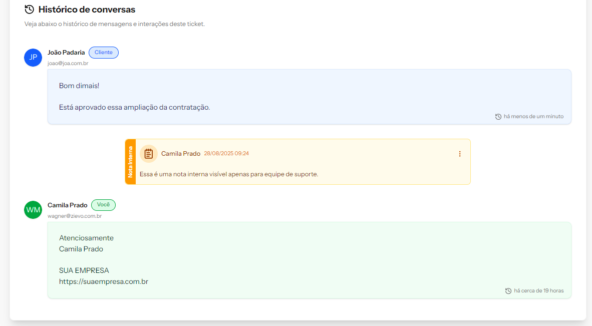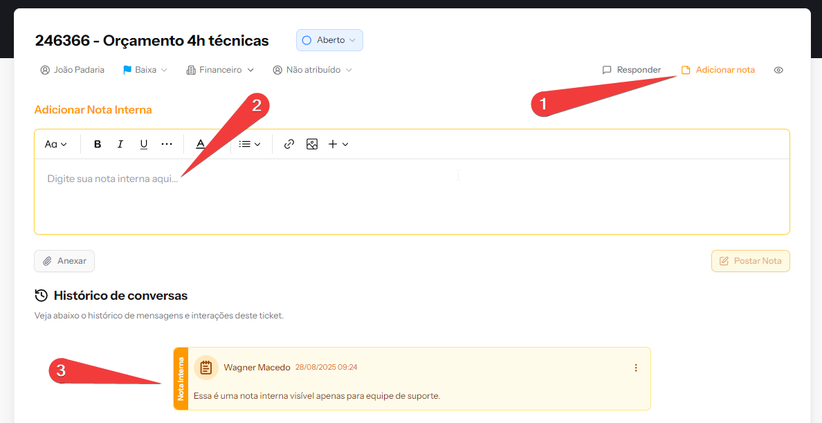 Essas notas são usadas apenas pela equipe de suporte e não ficam visíveis para o cliente.