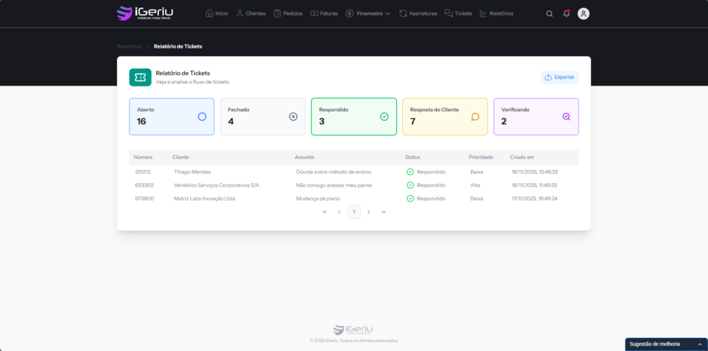 Esse recurso é essencial para acompanhar a carga de atendimento da equipe e identificar gargalos no processo de suporte.