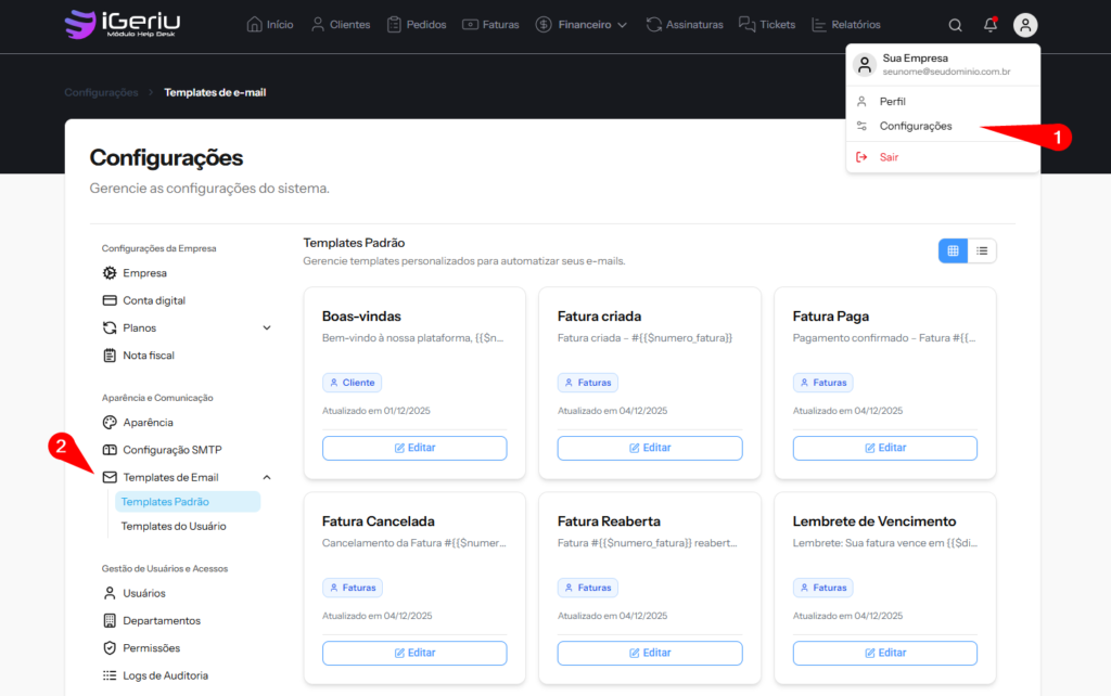 O módulo de SMTP e Templates de E-mail garante que todas as mensagens automáticas do sistema sejam enviadas de forma segura e personalizada.
