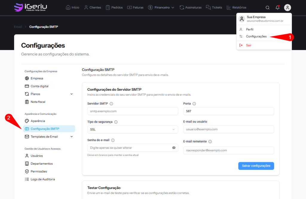 Teste o envio após configurar o SMTP para confirmar a autenticação correta.