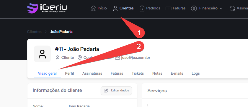 A aba Visão Geral funciona como o painel principal do cliente.