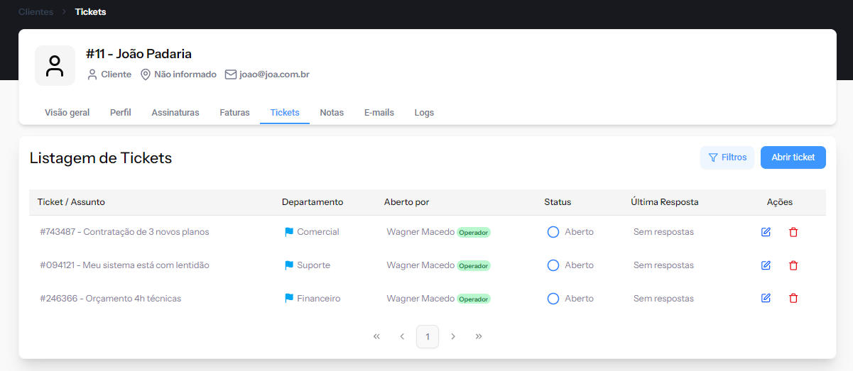 A aba Tickets reúne todas as interações de suporte do cliente: