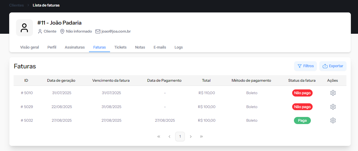 Na aba Faturas, você encontra o histórico financeiro do cliente: