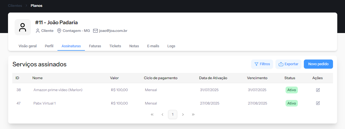 A aba Assinaturas exibe os planos e serviços ativos do cliente.