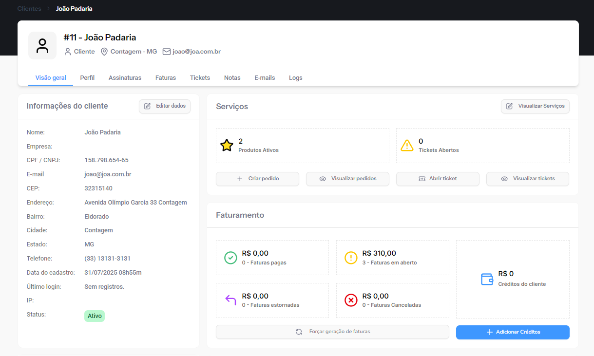 Visão Geral, Perfil, Assinaturas, Faturas, Tickets, Notas, E-mails e Logs