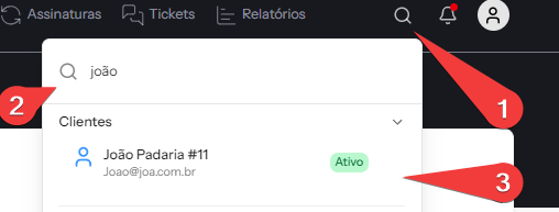 Ou utilize a busca global no topo do sistema, digitando o nome, ID, e-mail ou documento do cliente.