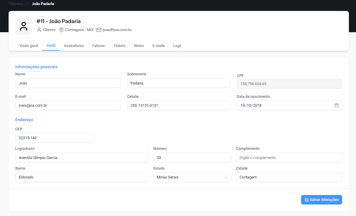 Na aba Perfil, ficam armazenados todos os dados cadastrais completos do cliente, como: